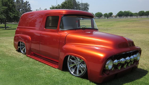 Custom car 1956 Ford Panel T low riding with panels and ready for some drag racing.