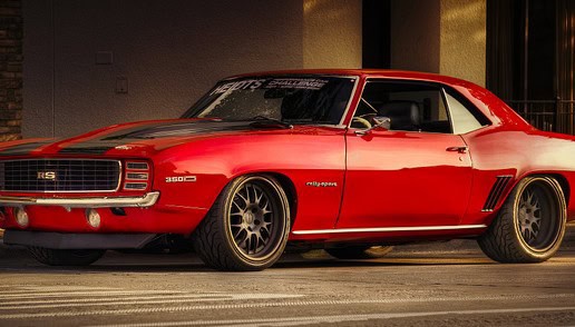 1969 Camaro RS muscle car. The RS was an appearance package that included hidden headlights, revised taillights with back-up lights under the rear bumper, RS badging, and exterior bright trim.