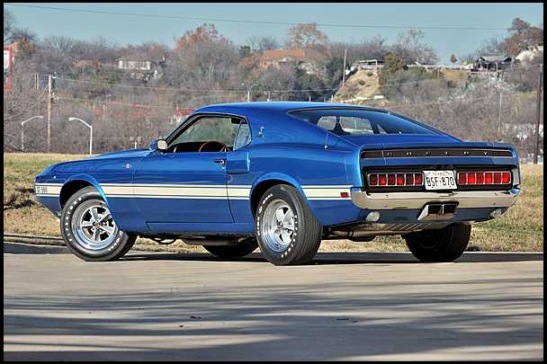 1969 Shelby GT500 Fastback with 428/335HP. Only 210 Shelby GT500 Fastbacks were produced in Acapulco Blue in 1969. This one has a Ram Air 428 Cobra Jet with a black interior, power steering and power disc brakes.