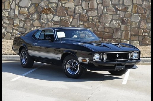 This black on black 1973 Ford Mustang Mach 1 Fastback muscle car is equipped with a 351 Cleveland engine, FMX automatic transmission a Sportsroof, vinyl bucket seats, power steering