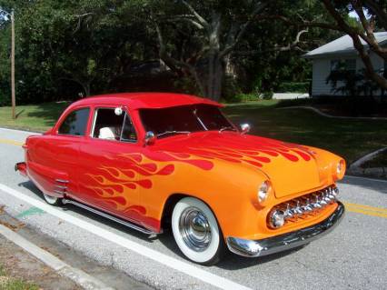 Custom Orange Lead Sled shoebox. This old car looks smoking hot in dark orange with light orange flames.