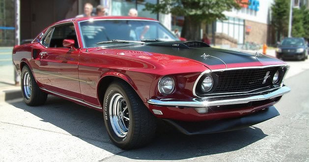 1969 Ford Mustang 1969 Ford Mustang. Beautiful red muscle car with distinct thick black stripe on the hood.