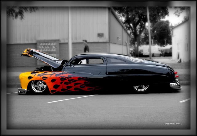 1951 Mercury Eight Sled custom old car restored and painted in glossy black with smokin’ flames painted on the sides. … Read more