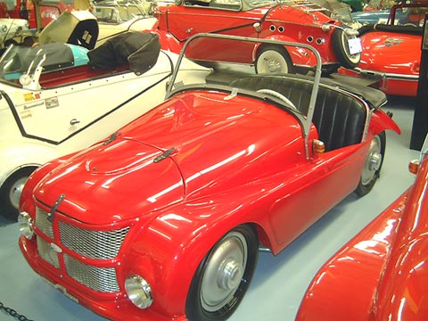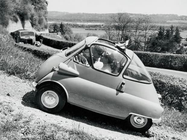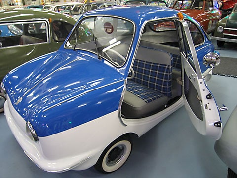 1956 Fuldamobil S-6. A German 3 wheeled microcar with a small bench seat in the back.