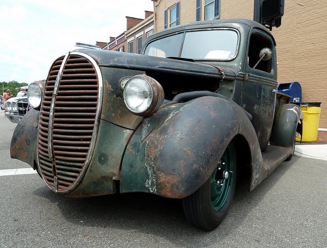 1938 Ford Pickup Truck. Rusty green old car that looks pretty cool without a custom paint job.