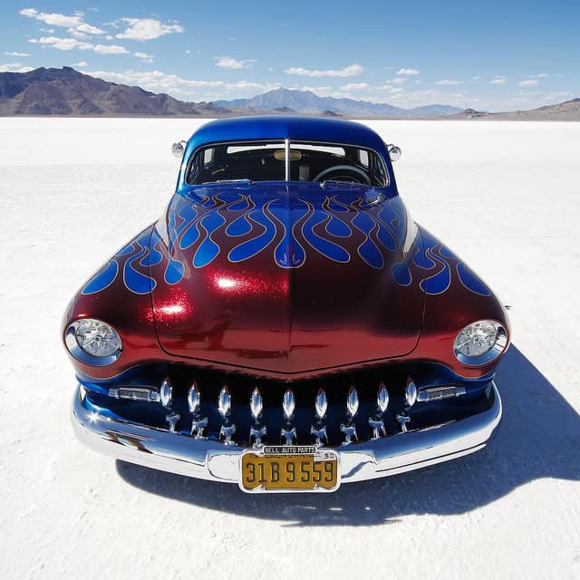 Beautiful blue custom restored old classic car with red flames. Set in the Salt Flats preparing for the Bonneville races.