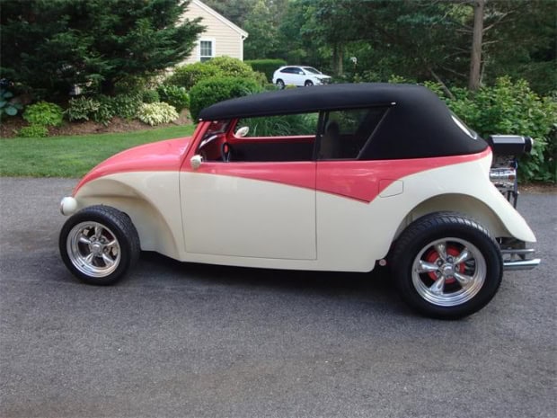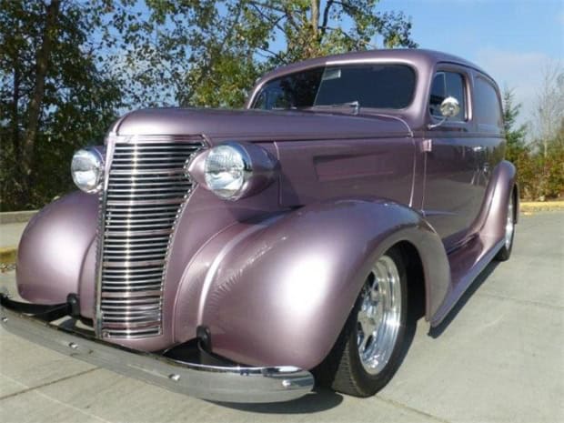 1938 Chevrolet Sedan. This old car has been fully restored and painted in metallic pink.
